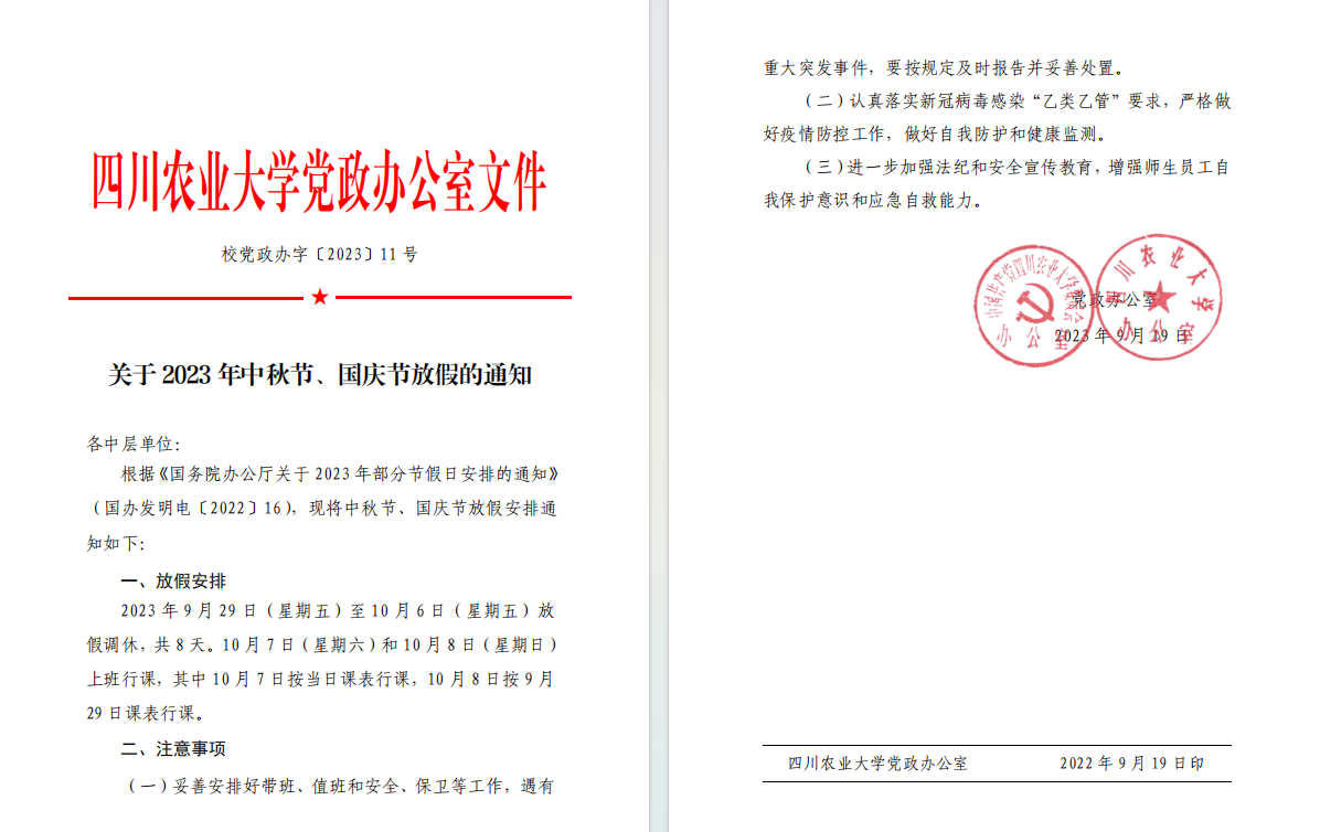 a片网站 2023年中秋节、国庆节放假的通知及值班安排