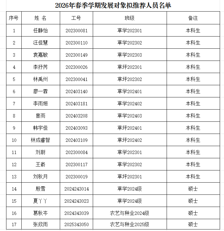 党委审查通过,拟发展任静怡等17名同志为发展对象(名单见附件)。现将其有关情况公示如下: