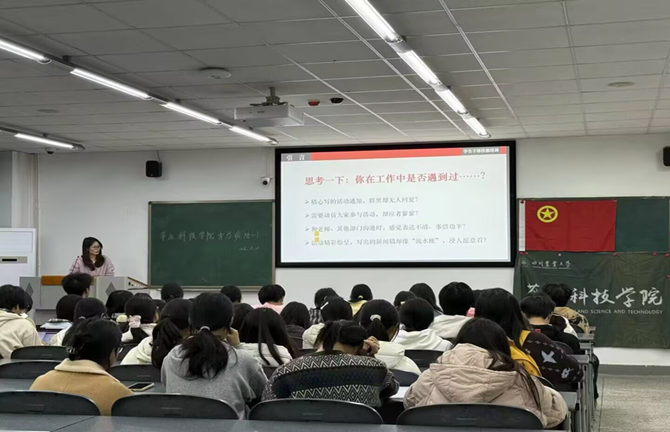 兼职辅导员刘静以“高效沟通与新闻写作能力提升”为主题展开系统讲解。在沟通方面,她从沟通的定义与作用出发,解析了有效沟通在团队协作中的关键意义,并分享了日常实用的沟通技巧与表达策略。在新闻写作环节,她从结构规范、语言凝练、逻辑构建等方面介绍了基础写作方法,引导学生跳出“流水账”式写作,提升稿件的可读性与传播力。