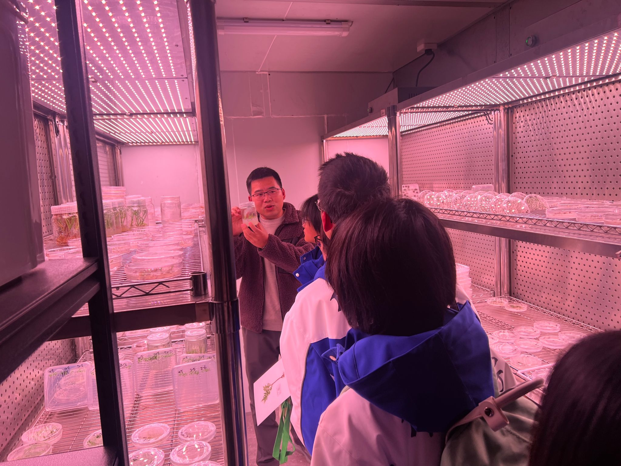 实验室。在冯老师和志愿者的引导下,同学们近距离观察了先进的科研设备、生长中的草本种苗以及正在进行的实验项目。冯老师针对同学们提出的实验原理、科研流程等问题进行了细致解答,激发了大家对科学研究的浓厚兴趣。