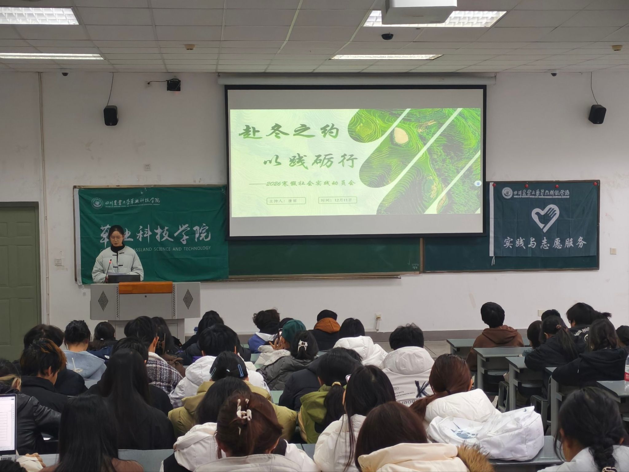 于12月11日下午在4A-207教室举办2026年寒假社会实践动员大会。各年级共计180余名学生积极参与,共同凝聚实践共识,明确行动方向。